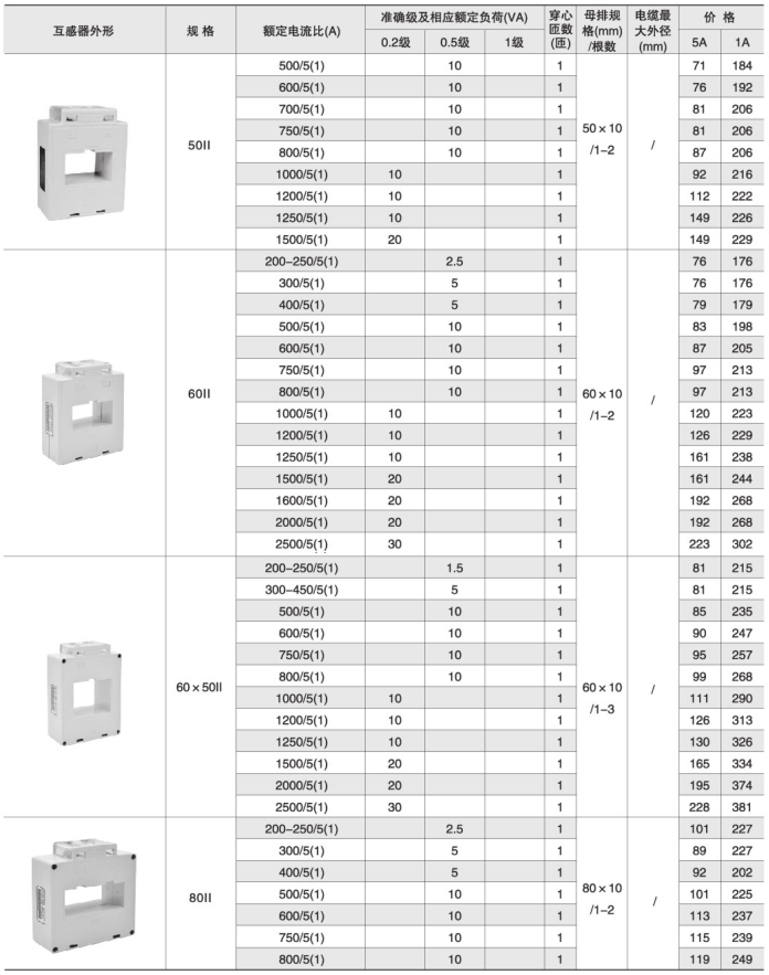 規格 額定電 流比 準確級 穿心 匝數 母排規格(mm)/根數 電纜最大 外徑(mm) 安裝方式