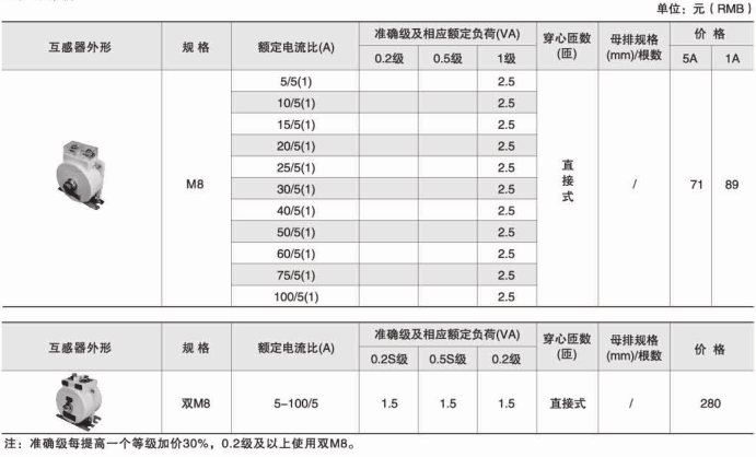 規格 額定電流比(A) 準確級及相應額定負荷(VA) 穿心匝數(匝) 母排規格(mm)/根數 安裝方式