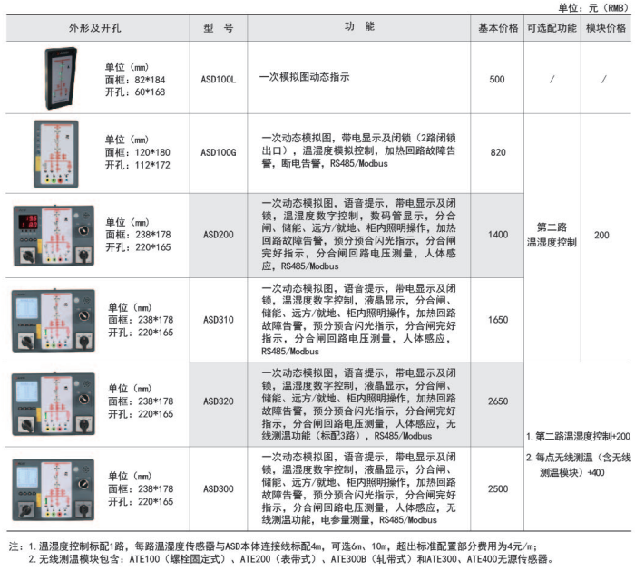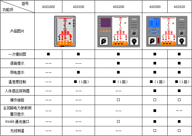 ASD系列開關柜綜合測控裝置具有一次回路模擬圖及開關狀態指示、高壓帶電顯示、自動溫濕度控制、人體感應自動照明、語音提示、電參數測量及RS485通訊接口等功能,集操作、顯示于一體,直觀地體現柜內元件的工作狀態及工作環境。