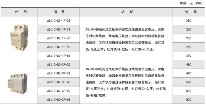 ASJ10-GQ系列自復(fù)式過欠壓保護(hù)器(以下簡(jiǎn)稱ASJ),適用于單相交流電壓230V或三相電壓400V,頻率50Hz,額定工作電流至63A及以下的用戶或負(fù)載。由中性線故障引起的單相或三相線路過、欠電壓時(shí),保護(hù)器對(duì)用電設(shè)備進(jìn)行保護(hù)。型號(hào)規(guī)格: