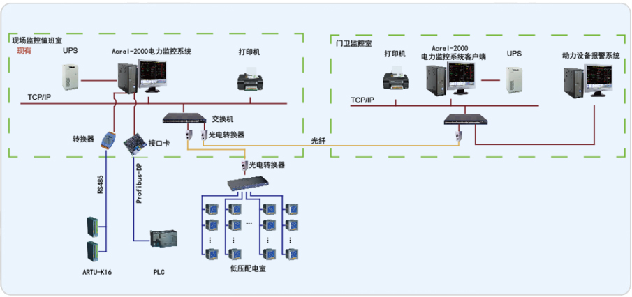 飛浦電子技術(上海)有限公司動力房設備報警系統,是在現有報警系統的基礎上進行的智能化改造項目。原有系統基于西門子PLC采集現場各種傳感器變位或報警信號,再通過聲、光形式輸出報警信號。為了便于管理和維護,將動力房設備報警系統PLC數據以及部分未接入PLC的報警開關量通過安科瑞ARTU裝置采集至現有的安科瑞Acrel-2000電力監控系統;在門衛監控室增加兩臺監控計算機,一臺作為安科瑞Acrel-2000電力監控系統客戶端,另一臺整合了動力房設備報警系統遠程訪問客戶端;原監控值班室和門衛值班室之間通過光纖組建局域網,實現系統遠程監控。