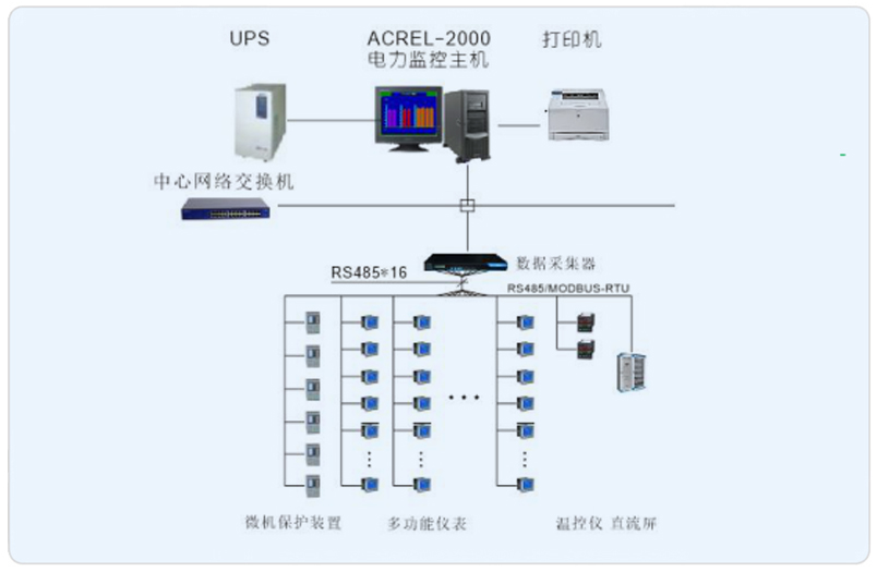 系統(tǒng)采用Acrel-2000型電力監(jiān)控系統(tǒng),分別在利爾達和利合達各設置一套電力監(jiān)控系統(tǒng),實現(xiàn)對高低壓配電回路的實時監(jiān)控,有利于用電管理。另一方面,電力監(jiān)控系統(tǒng)不僅能夠準確的表示出回路的用電狀況,它還具備網(wǎng)絡通訊等功能,能夠與計算機、串口服務器等設備進行組合,從而實現(xiàn)遠程監(jiān)控。