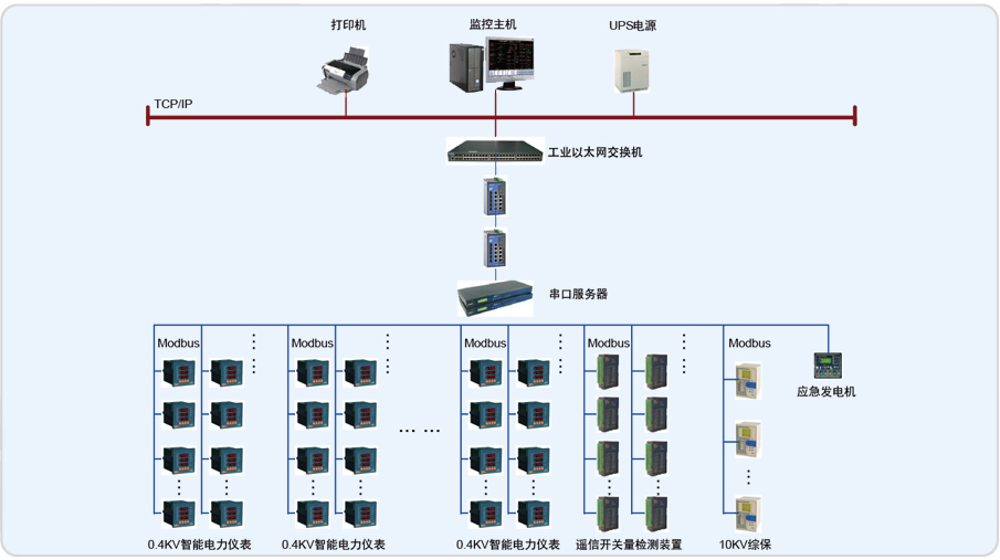 溫州喜來(lái)登大酒店有一大一小兩個(gè)配電室,都位于裙房3層,應(yīng)急發(fā)電機(jī)位于裙房地下2層。配電監(jiān)控系統(tǒng)監(jiān)控范圍內(nèi)的6臺(tái)ABB REX521微機(jī)保護(hù)裝置,7臺(tái)ACREL ACR320EK網(wǎng)絡(luò)電力儀表、128臺(tái)ACREL PZ96-E4可編程智能儀表及4臺(tái)LD-B10變壓器溫濕度控制儀集中分布于兩個(gè)配電室內(nèi)。英國(guó)深海5220應(yīng)急發(fā)電機(jī)位于裙房地下二層的發(fā)電機(jī)室,其運(yùn)行數(shù)據(jù)由555控制模塊采集并上傳至上位監(jiān)控主機(jī)。
