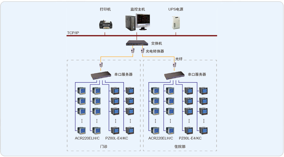 整個(gè)系統(tǒng)采用網(wǎng)絡(luò)分布式結(jié)構(gòu),監(jiān)控主機(jī)位于報(bào)告廳和外科樓的地下一層的動(dòng)力中心中。該項(xiàng)目實(shí)現(xiàn)了哈醫(yī)大一院2個(gè)樓內(nèi)遠(yuǎn)程精細(xì)化及時(shí)性報(bào)警。設(shè)計(jì)方案為2個(gè)樓內(nèi)的2個(gè)配電室,儀表數(shù)據(jù)通過485接口,MODBUS通訊協(xié)議經(jīng)數(shù)據(jù)采集器輸送到值班室主機(jī)。