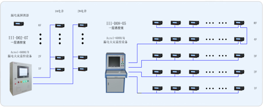 三湘廣場(chǎng)由III-D02-07地塊和III-D08-05地塊各自一獨(dú)棟商業(yè)建筑組成。為了確保本地塊的樓宇的電氣安全,現(xiàn)在樓層內(nèi)的配電箱進(jìn)線(xiàn)端安裝安科瑞品牌ARCM系列漏電流探測(cè)器,由此來(lái)實(shí)時(shí)監(jiān)測(cè)變電所內(nèi)重要回路的漏電流,并在III-D02-07地塊和III-D08-05地塊消控室內(nèi)安裝ACREL-6000電氣火災(zāi)監(jiān)控設(shè)備,以確保變電所配電系統(tǒng)的電氣安全。