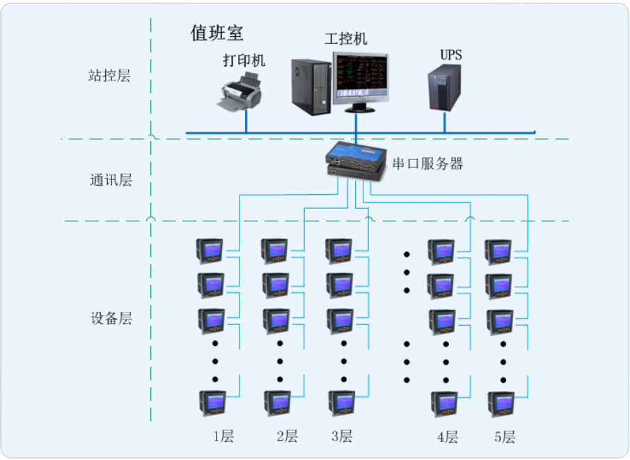 本項目是為羅店鎮市民服務中心樓層配電部分設計的電能管理系統,監控范圍為8層樓內的多功能儀表?,F場多功能儀表通過總線接入值班室采集器,再將通過采集器連接到監控主機,從而在監控主機上實現總線上儀表與監控主機的數據連通。通過Acrel-3000電能管理系統對樓層用電環節進行記錄與統計,借助計算機輔助手段進行集抄,節省人工成本。
