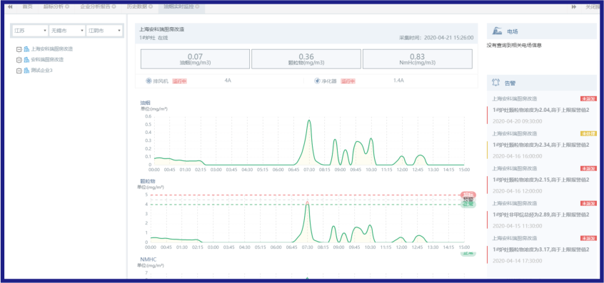 現場安裝監測終端,持續監測油煙凈化器的工作狀態,包括設備運行的電流,同時結合排煙口的揮發性物質、顆粒物濃度等進行對比分析,一旦排放超標,系統會發出異常信號。