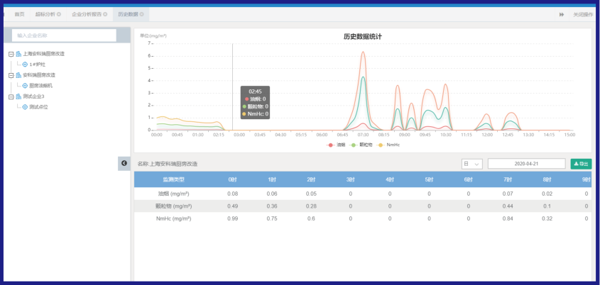 對油煙排污數據的監測,包括油煙排放濃度,顆粒物,NmHc等數值采集監測;同時對監控風機和凈化器的啟停狀態、運行數據進行監測。